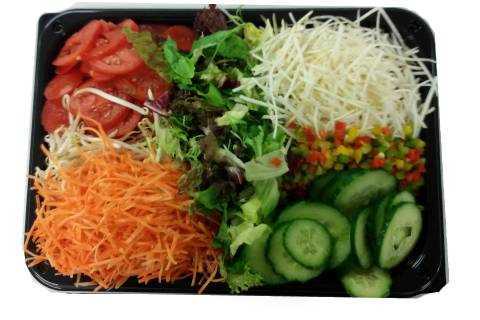 Geraspte wortel, tomaat, gemengde sla, komkommer, paprika en jonge soja scheutjes, geraspte knolselder