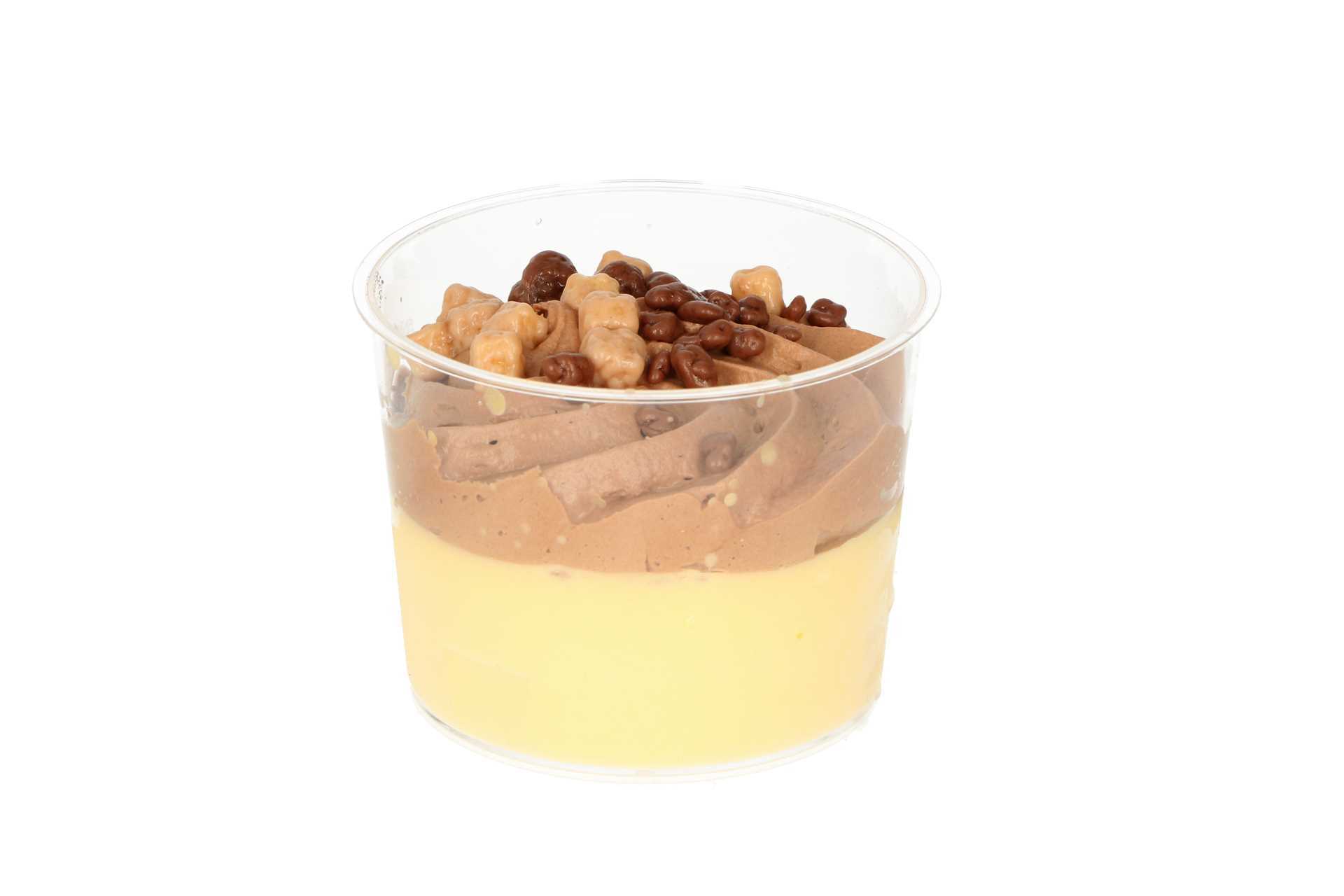 Een ambachtelijke crème brulée met daarop een laagje chocolademousse afgewerkt met chocolade caramel crunch