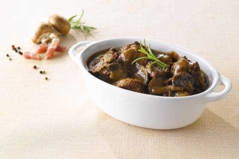 Heerlijke ragout van zachtgegaarde ever in rode wijn met wildfond, champignons, spek, tijm en laurier.