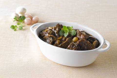 Een heerlijk mals hertenstoofpotje in een krachtige rode wijnsaus met spekblokjes en paddenstoelen.