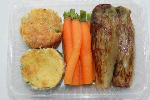 Gebakken witloof, geglaceerde jonge worteltjes,